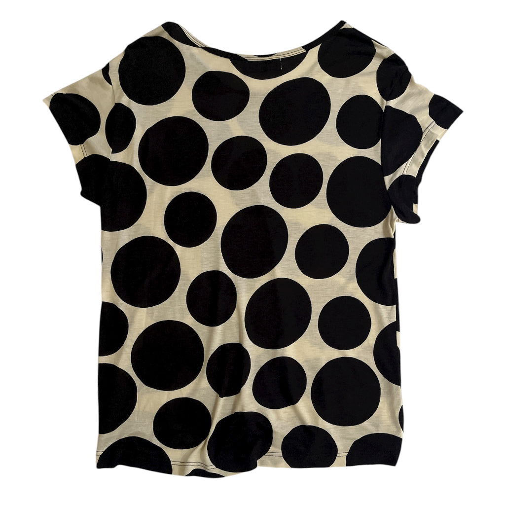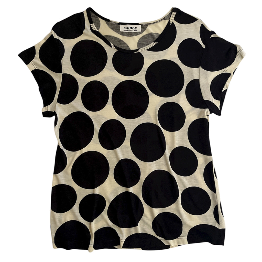 100% jersey cotton with polka dot pattern is up-cycled from The Tokyo (one of the very first WHOLE pieces).  Scoop neck, cropped fit with cropped angle sleeves.  Amazing fit that flows to any contour of your body and drapes like a dream.  One of one item.